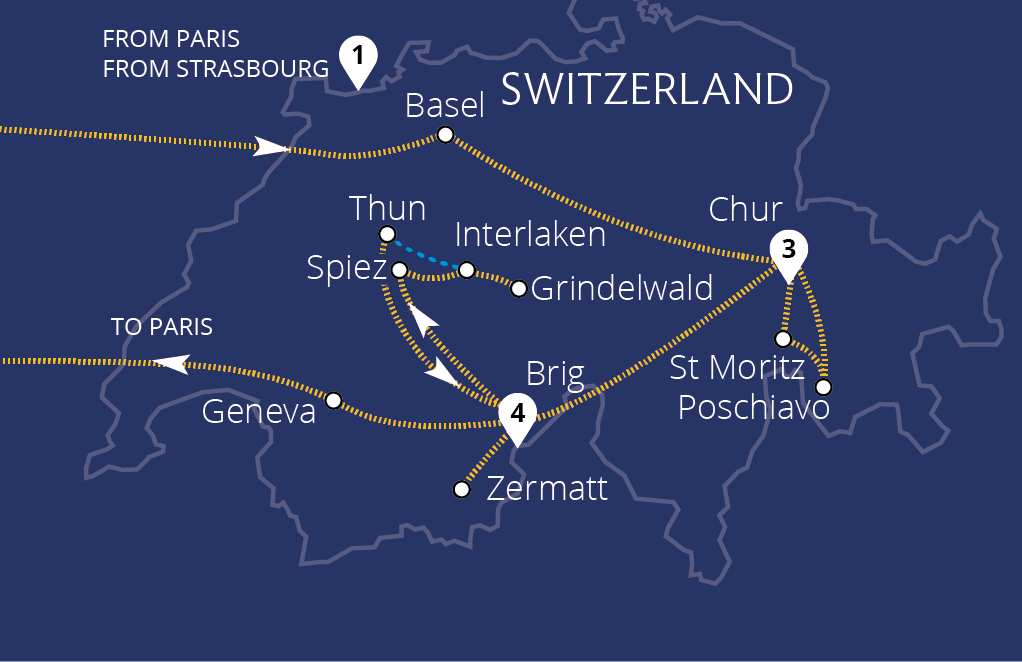 • Stay in 4-Star Swiss hotels, enjoying spectacular lake and mountain views