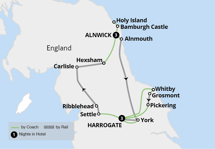 Encounter the untamed North York Moors and rolling Yorkshire Dales aboard the nostalgic North Yorkshire Moors Railway and famed Settle-Carlisle line, before discovering the gems of Northumberland on a tour which blends dramatic landscapes with fascinating history and culture. In Yorkshire, wander among the spectacular gardens of RHS Harlow ...
