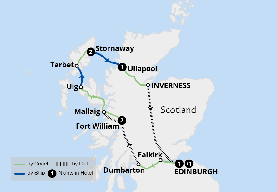 Discover the wild charm of the Outer Hebrides and the Scottish Highlands on this culture-packed eight-day tour. Journey through Scotland's stunning landscapes, as historic castles, fishing villages and breathtaking natural beauty set the scene. Explore Edinburgh, witness the wonder of modern engineering at the Falkirk Wheel, and experience...