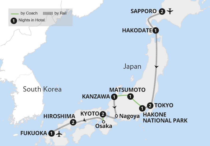 Highlights include: going up the Sapporo tower; having fresh fish in Hakodate and seeing the old fort; getting a glimpse of Mt Fuji in Hakone; the Hamarikyu gardens and Senso-ji temple in Tokyo; the amazing art of Chihiro Iwasaki in Matsumoto; experiencing an Onsen in Takayama; the train museum in Kyoto and the bamboo forest; seeing the world's biggest bronze Buddha and the Nara deer park; the memorial in Hiroshima and seeing the Torii gate on Miyajima.