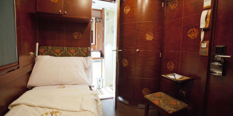 This cosy cabin is wood panelled throughout and evokes an era of classic train travel across Europe. Two single beds for the night-time become armchairs by day, providing you with a comfortable living area. Your private bathroom has a shower and all bathroom amenities, giving you everything you need for an atmospheric stay overnight onboard the Al Andalus.