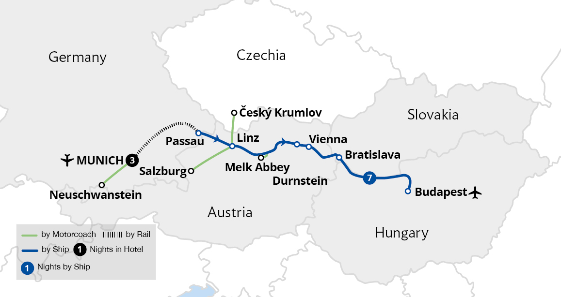 From beautiful Bavaria to the glorious surroundings of the Wachau Valley and Europe's fantastic cities, this tour and cruise holiday is a showcase of diverse scenery. The experience begins on land, with three days in Munich in the heart of Bavaria. Our time here takes us to Neuschwanstein Castle and introduces Munich's highlights and...